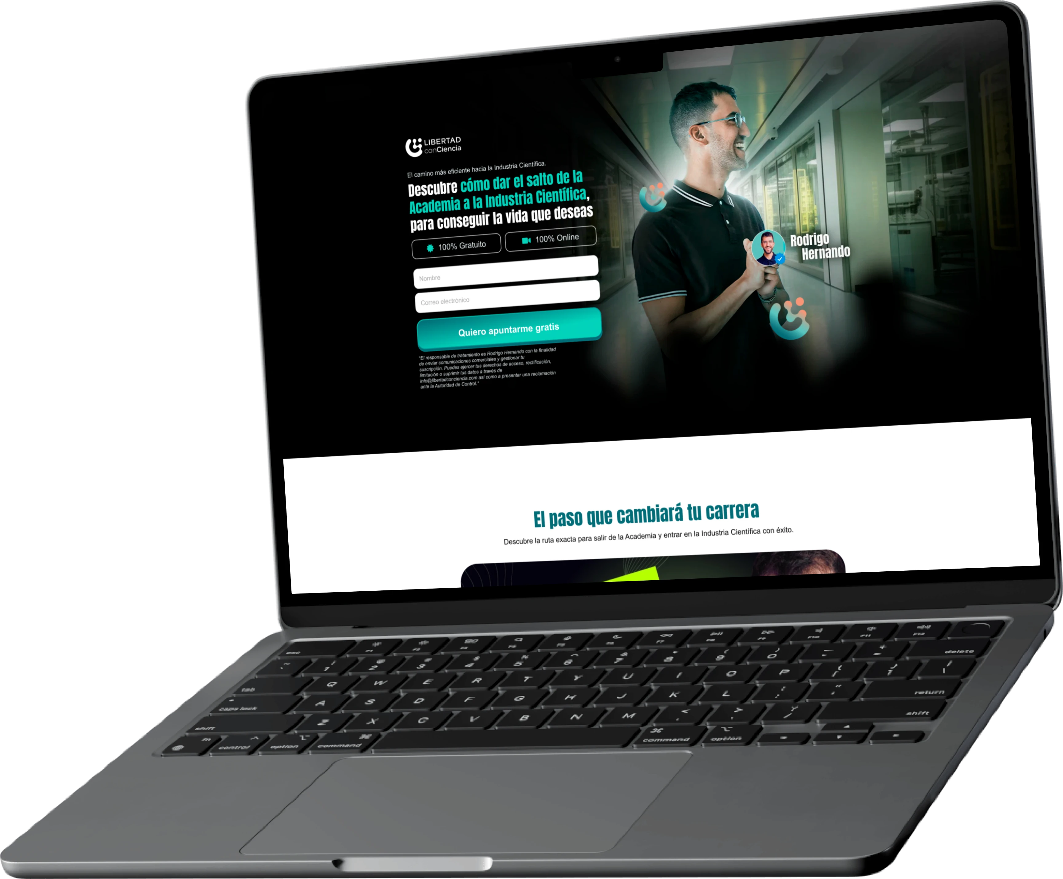 Libertad con Ciencia es una iniciativa liderada por Rodrigo Hernando, enfocada en brindar herramientas, acompañamiento y oportunidades a científicos que buscan estabilidad profesional fuera de la Academia. El proyecto necesitaba una presencia digital clara, ordenada y persuasiva para comunicar su mensaje con fuerza y generar confianza en su comunidad.
